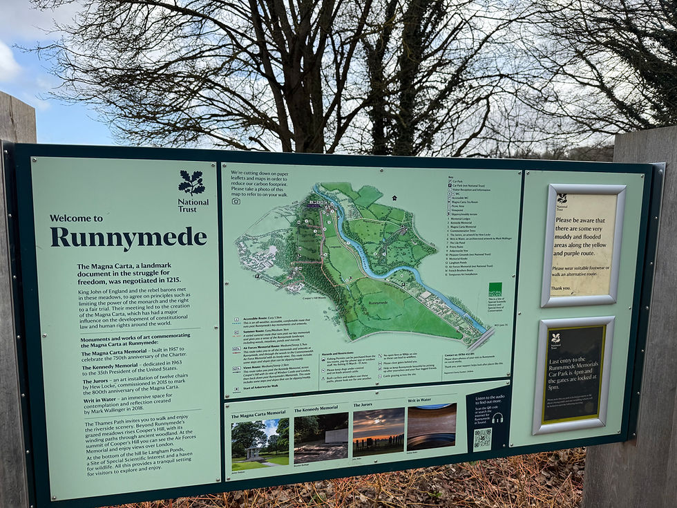 Runnymede is a National Trust site in Surrey, a few miles outside of Windsor, consisting of a water-meadow next to the Thames. It contains lovely walking trails, a small cafe, and several memorials. It was chosen as the meeting point for King John and his rebellious barons as it was neutral territory and therefore become famous as the place where the Magna Carta was signed on 15 June 1215. This document established fundamental rights and the rule of law.